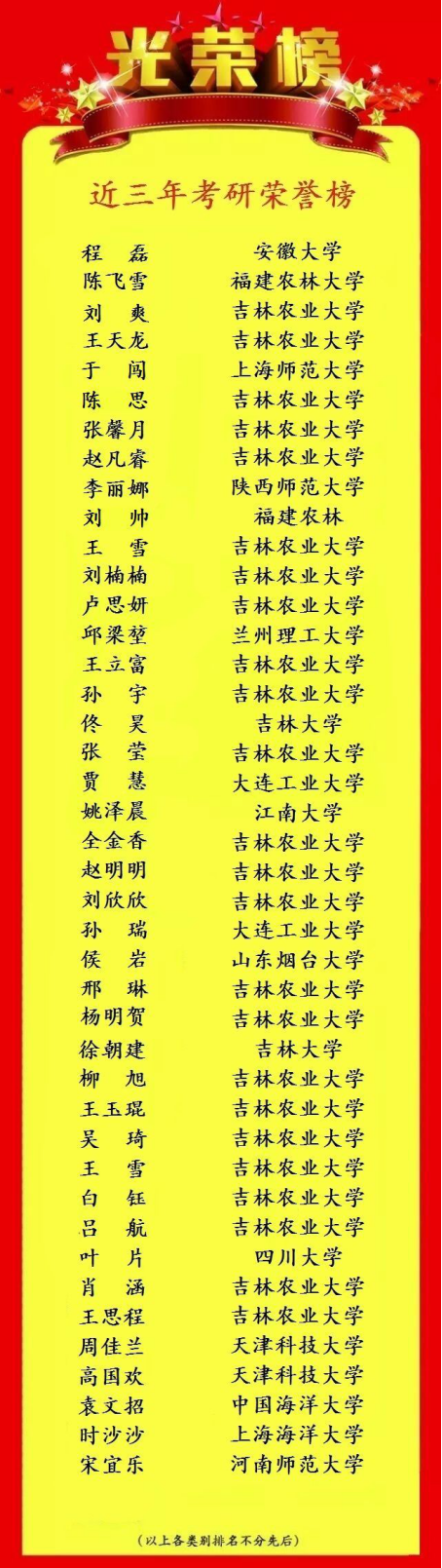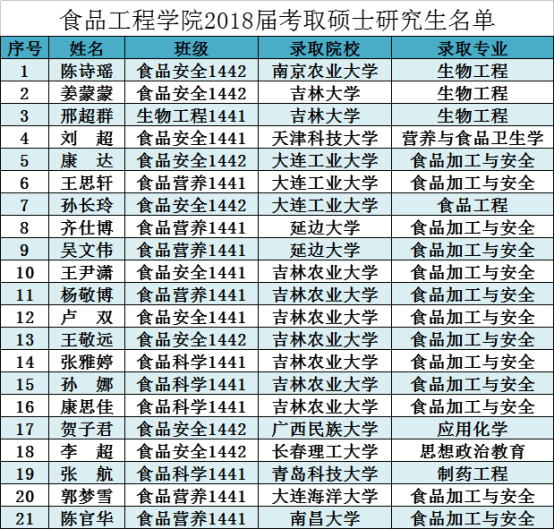 在食品工程学院师生的共同努力下,学院2018届毕业生考研情况再创佳绩,上线人数、录取人数均创历史新高,有21名毕业生考取硕士研究生,占本届毕业学生的11.8%,更有6人分别被吉林大学、延边大学、南京农业大学、南昌大学等985、211院校录取。
