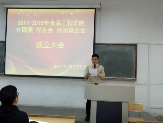2017年11月27日,食品工程学院老师和新一届学生分团委、学生会、社团联合会全体成员,在第二教学楼107阶梯教室齐聚一堂,共同召开了食品工程学院2017届分团委、学生会、社团联合会成立大会。党总支副书记董娅、分团委书记王戈,也应邀出席本次大会。