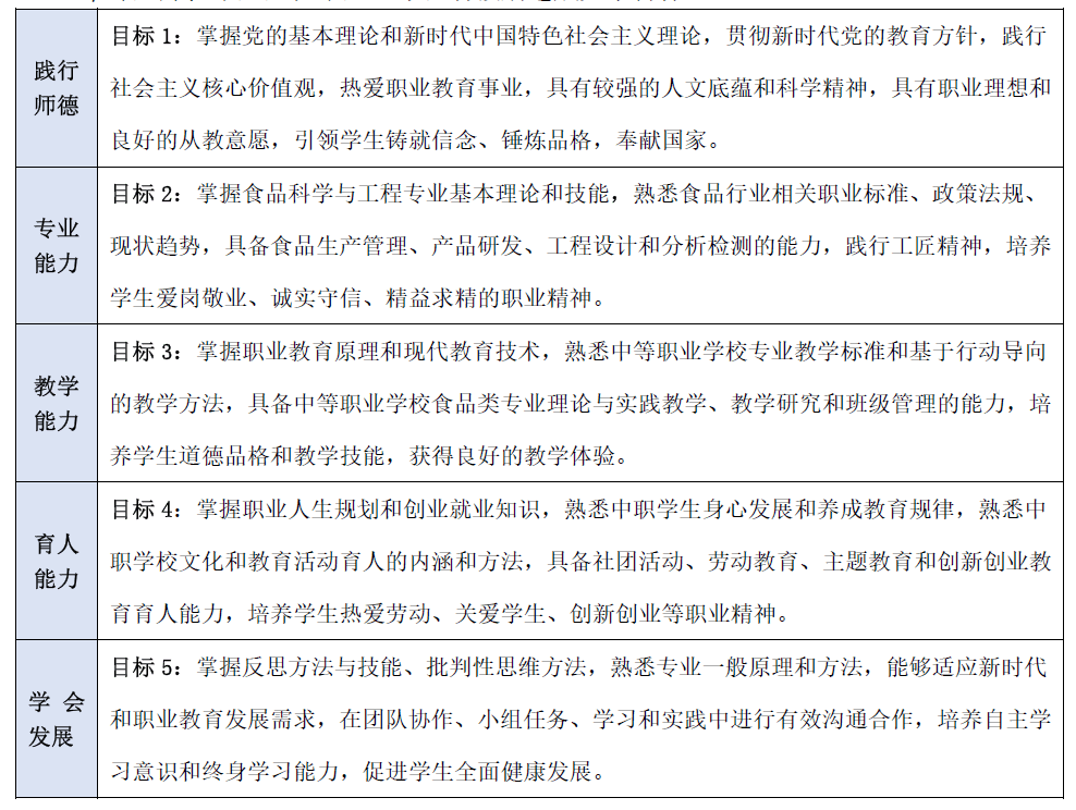 食品科学与工程专业培养目标 来源:培养目标 2021/07/09 (一)培养目标 本专业主动适应国家职业教育发展需求,立足吉林、辐射全国,培养德智体美劳全面发展,掌握食品科学与工程专业基础知识和职业教育基本原理与教学方法,具有较强职业教育教学能力和食品生产管理、产品研发、工程设计和分析检测专业实践能力,具有创新思维和终身发展能力,践行工匠精神,能胜任中等职业学校等教育领域食品类专业教学、教研和管理工作的高素质“双师型”教师。 (二)目标内涵 本专业师范毕业生在毕业5年左右预期达成如下目标:
