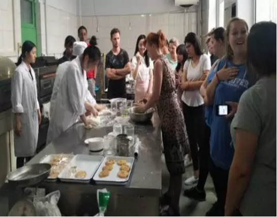 外宾们随后兴致勃勃地参观了烘焙坊。白宝兰老师提前准备了我国传统糕点—桃酥,供外宾享用。随后在白老师的指导下,纷纷亲自动手制作了白皮月饼。