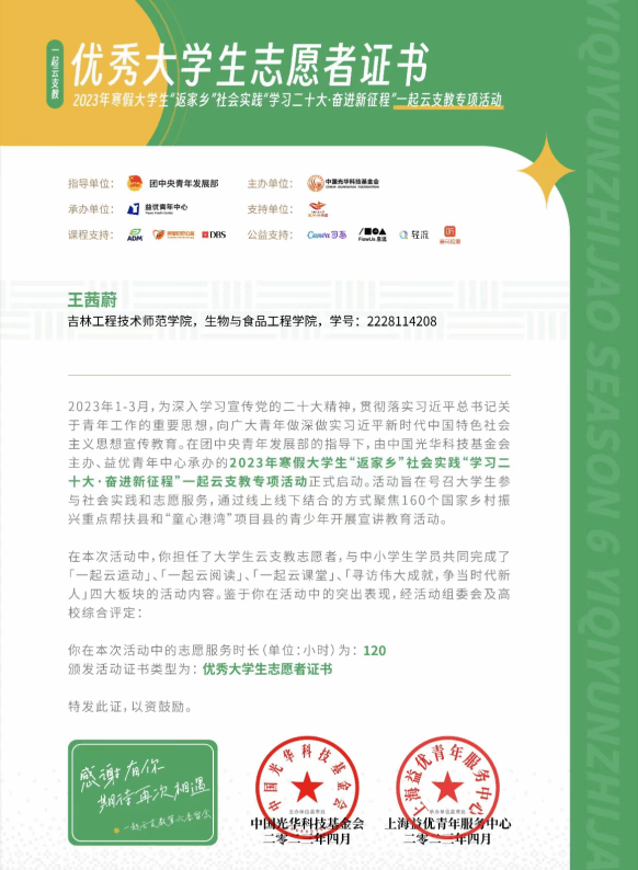 同时该支部书记王茜蔚积极参加“返家乡”“三下乡”等实践活动并获得优秀志愿者称号,起到先锋模范作用。暑期伊始,为深入学习宣传党的二十大精神,学习贯彻习近平总书记视察吉林重要讲话重要指示精神。