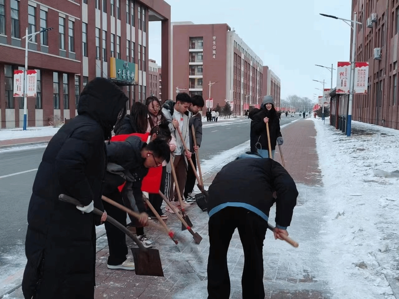 雪寒人心暖,携手清积雪。由志愿者组成的队伍迅速行动,不畏寒冷,齐心协力,清理校内积雪、铲除薄冰。在保障老师及学生出行安全的同时,进一步弘扬了雷锋精神,以实际行动传递温暖幸福感与安全感。