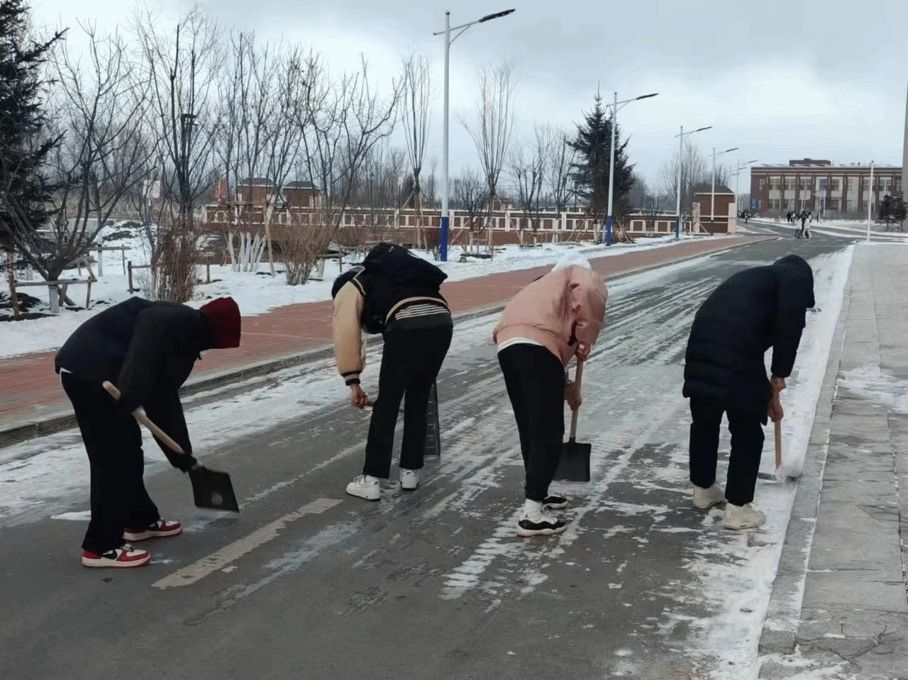 同时提醒过往师生多加注意、谨防路滑、安全出行。虽然天气寒冷,但大家干劲十足,不怕苦、不怕累,全身心投入到清雪扫雪工作中,积极的劳动场面让寒冷的天气也显得暖意浓浓,经过两个小时清扫,大家开通了一条畅通的“暖心路”“安心路”,保证了师生的出行安全。