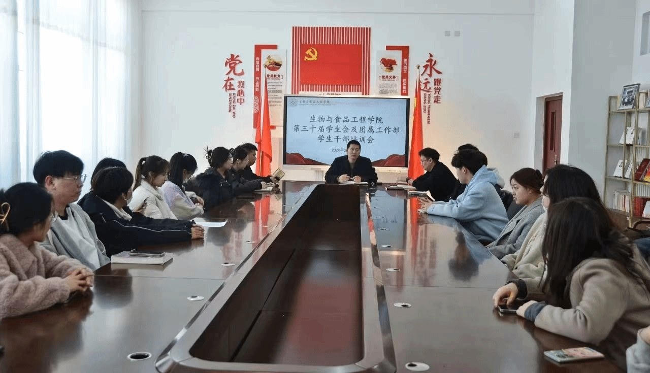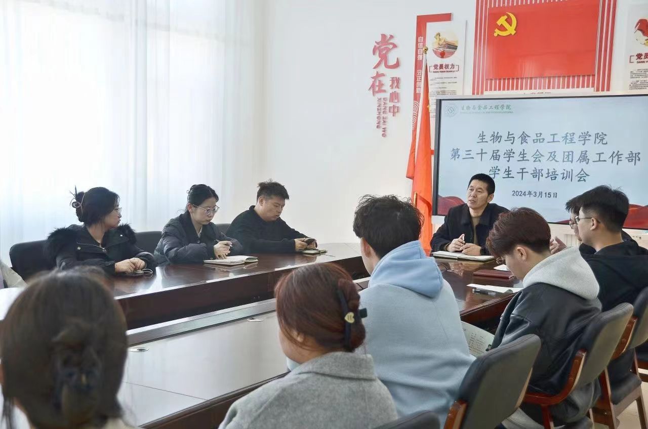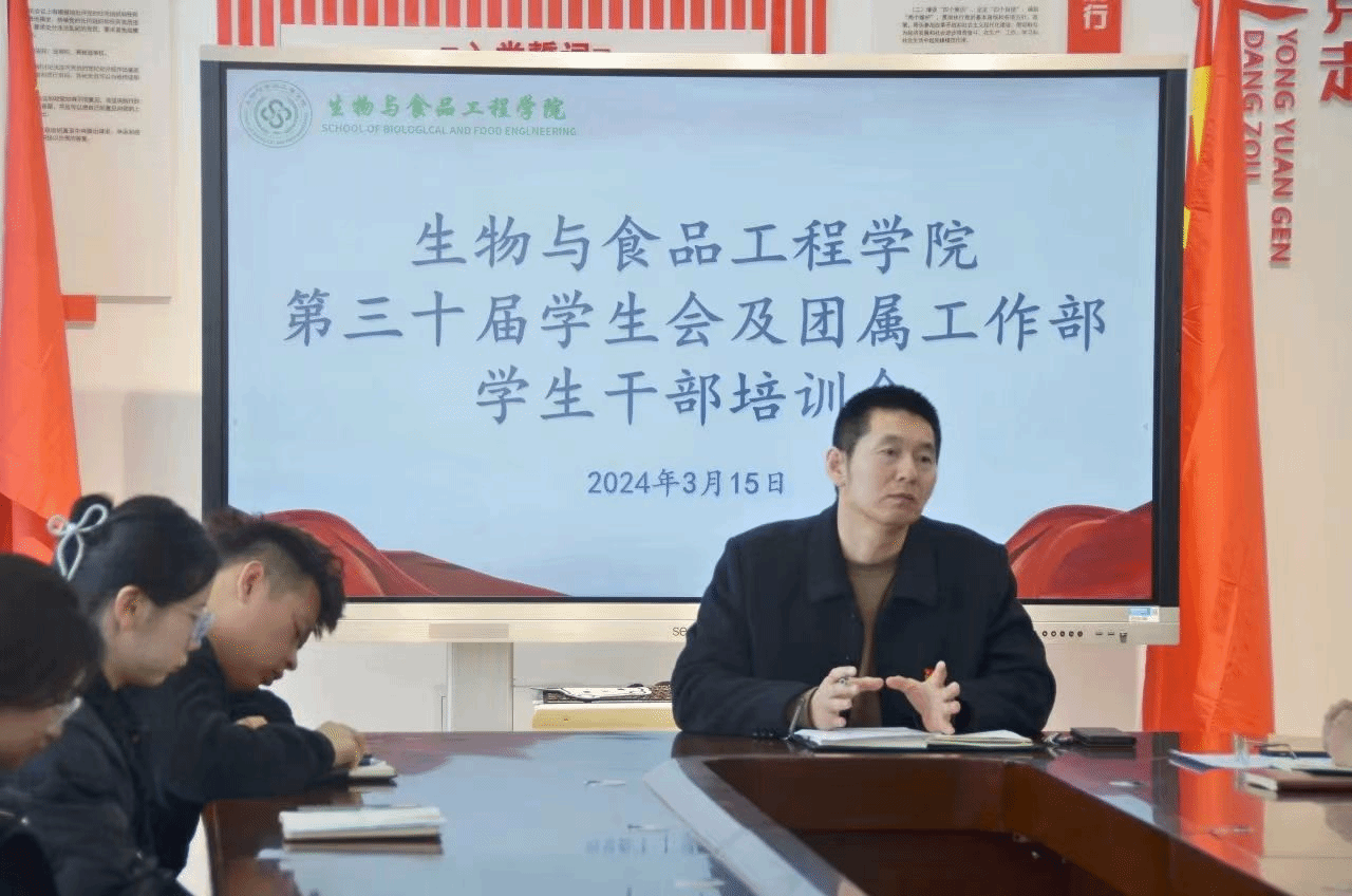 为了培养一支具有卓越领导力和创新精神的学生干部队伍,提升学生会及团属工作部的整体工作效能,2024年3月15日中午yl9193永利集团于食品楼419开展了学生干部培训会。此次会议由党总支副书记杨德成主持,团委书记加依达尔·阿扎提、辅导员王庆波、高萍及学生干部参加本次会议。