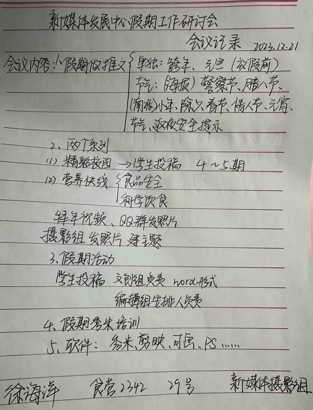 为进一步落实2023年度学生干部学期总结大会会议精神,巩固新一届新媒体发展中心工作成果,反思工作过程中亟需改进的方面,全面提升新媒体干事能力, 新媒体发展中心全体干部于2023年12月21日线上召开腾讯会议,总结学期工作内容,并且安排假期相关工作,保证新媒体发展中心假期正常运转。
